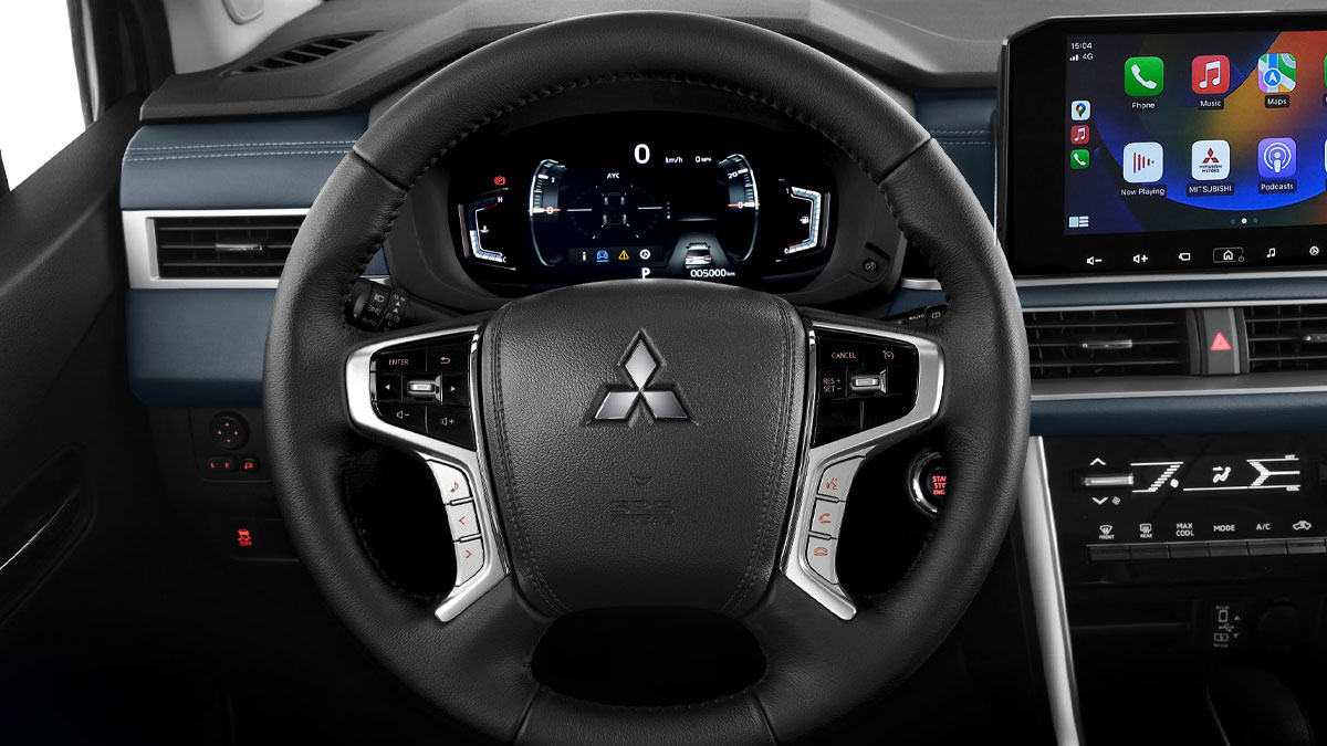 Nội Thất Mitsubishi Xpander Cross mới với phong cách SUV đặc trưng được thể hiện thông qua từng chi tiết trong nội thất: Vô lăng 4 chấu thể thao được thừa hưởng từ mẫu xe Pajero Sport tích hợp các phím điều khiển đa chức năng mang đến sự thuận tiện trong quá trình thao tác và vận hành xe. Đồng hồ kỹ thuật số sau vô lăng, có kích thước lớn 8 inch giúp hiển thị trực quan đa dạng thông tin, dễ sử dụng với màu sắc bắt mắt hơn.
